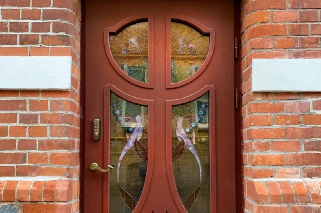 На двери старинного дома на Зоологической в Калининграде установили витражи с рыбами и птицами