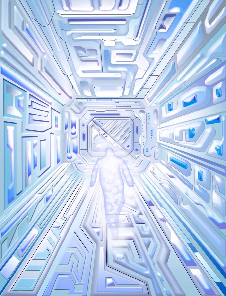 Сила тянет меня туда, влетаю в этот круглый люк и тоннель, лечу по нему головой вперёд, тело сковано, шевелить им не могу, словно его опутали какие-то множественные нити. Сначала тоннель виделся круглым и большим, потом сузился и стал квадратным, глазами вращаю в стороны и рассматриваю стенки тоннеля. Вижу, что они белые, с серыми и тёмными линиями блоков конструкции, проводами и трубами вдоль стен, на их поверхности видятся какие-то светящиеся экранчики, лампочки, кнопки, разного цвета, в основном синие, голубые, фиолетовые.