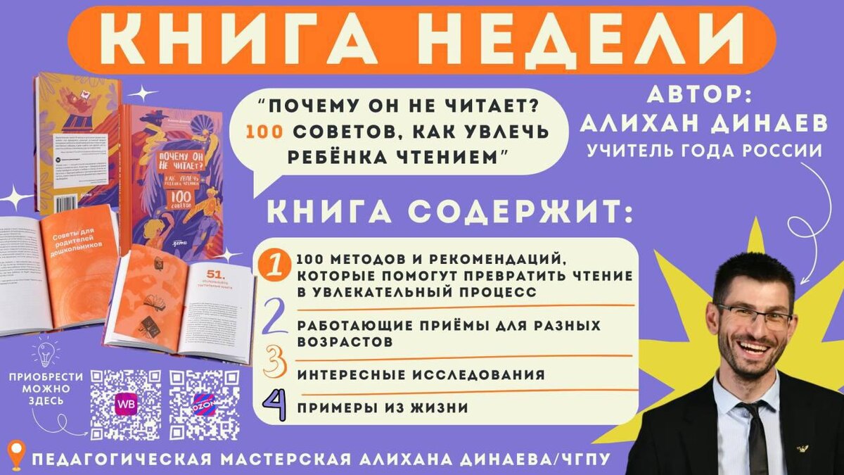 Еженедельная рубрика «Книга недели»! Каждую неделю мы предлагаем вам увлекательную и полезную книгу по педагогике, психологии, креативности и по другим важнейшим направлениям. И, конечно же, мы не могли пройти мимо новинки от Учителя года России, заведующего Педмастерской ЧГПУ Алихана Динаева - «Почему он не читает? 100 советов, как увлечь ребёнка чтением». В своей книге народный учитель ЧР Алихан Динаев предлагает более 100 проверенных способов, которые превратят даже самого заядлого непоседу в любителя книг. Эти методы подходят для детей всех возрастов – от дошкольников до подростков. Кроме практических советов, в книге представлены увлекательные исследования и реальные примеры из жизни автора. «Я хочу, чтобы мои дети читали хорошие книги и приобщались к бескрайнему миру отечественной и мировой литературы. Если вы согласны со мной, то эта книга для вас», — пишет Алихан. Откройте мир чтения своим детям! Ещё больше полезных и интересных материалов на нашем телеграм-канале.