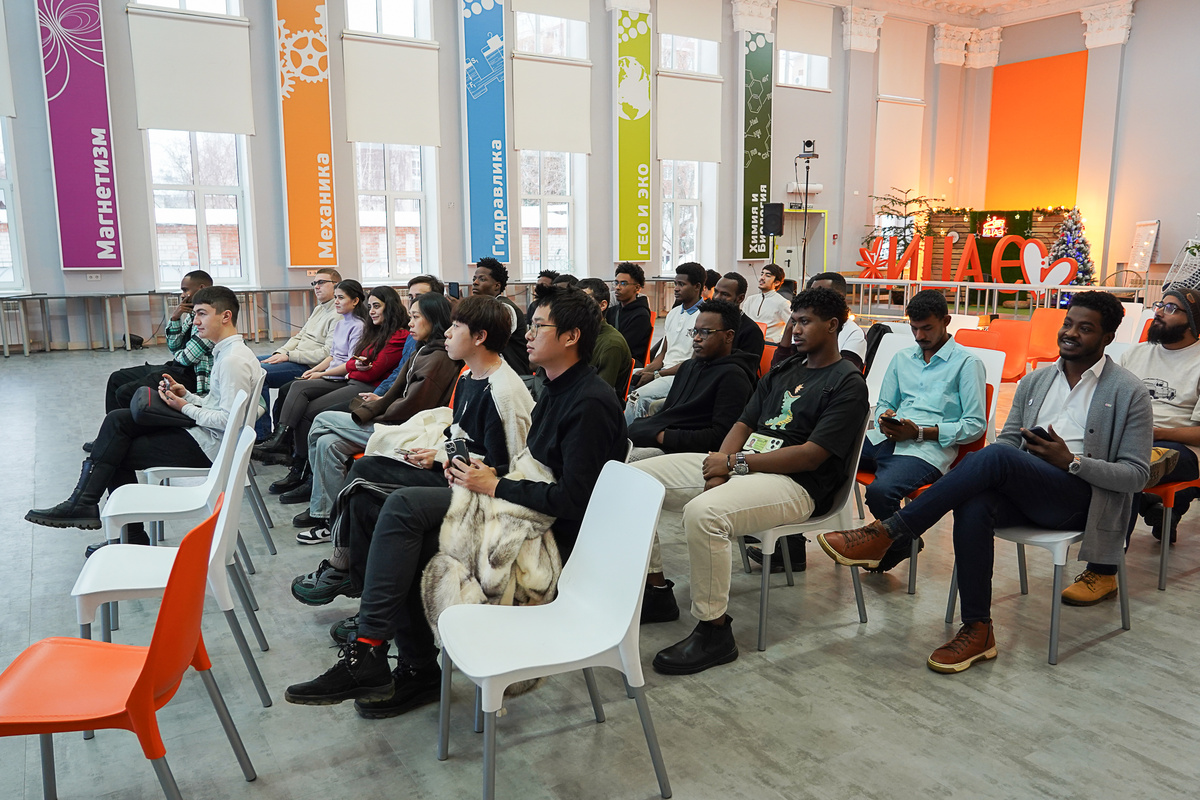 С приветственным словом к аудитории обратился проректор по международной деятельности ВятГУ Сергей Фомин: Новый год - это время, когда мы подводим личные итоги и строим новые планы. В каждой стране есть свои новогодние обычаи. В России Новый год - семейный праздник, когда мы собираемся за одним столом. Я хотел бы, чтобы сегодня вы как одна дружная семья прочувствовали волшебный момент русского Нового года.Желаю вам всего наилучшего, здоровья, счастья! Уверен, вы многого добьетесь в 2025 году и помните, что все зависит лишь от ваших стараний. Председатель Ассоциации иностранных студентов в Кировской области из ВятГУ Хайдар Халил продолжил мысль Сергея Валерьевича: Я очень рад, что нас всех объединил Вятский государственный университет. Пусть предстоящий год принесет вам новые знакомства и яркие моменты. Желаю всем отличной учебы и успешно сдать предстоящую сессию! Поздравить иностранных студентов крупнейшего вуза региона пришли главные сказочные персонажи русского праздника Дед Мороз и