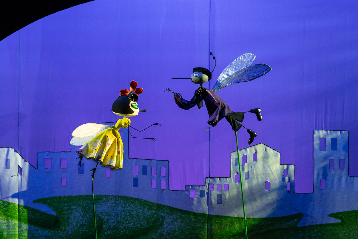 Будем танцевать!». Текст, вроде бы, простой, но с контекстом. Так что взрослым предлагается не только следить за детьми, но и за словами в спектакле. Режиссёр-постановщик Владимир Беркун и режиссёр сцен с куклами Александр Захарьев придумали историю, в которой чётко дают понять, что каждый волен делать свой выбор и держать за свой выбор ответ. Кузнечик в этой истории превращается в блогера, который ведёт блог о местной знаменитости. Комар ― бедный художник. Муха ― джаз-дива, точь в точь как в мультфильме! Будто сошла с экрана… Муха и Ком