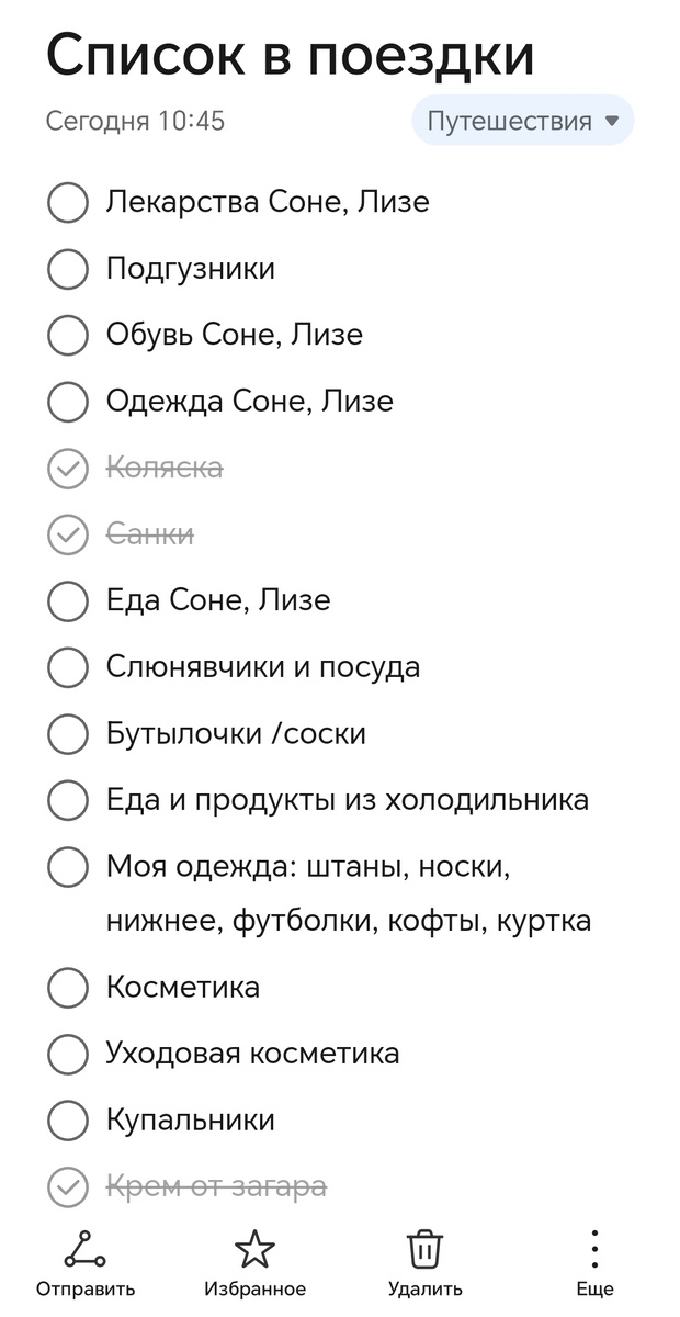 Вот уже несколько лет практикую Список в поездки. Вцелом, это статичный список, но я туда добавляю позиции по мере надобности. Перед каждой поездкой я его обнуляю. Что не нужно, сразу отмечаю, затем отмечаю то, что уже положила в чемоданы и так до победного. Удержать всё в голове просто нереально, поэтому это моё спасение 🥳😍