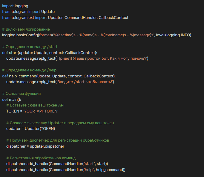 Создание бота в Telegram — это увлекательный и простой процесс, который не требует глубоких знаний программирования. В этой статье мы рассмотрим, как создать простого бота с помощью Python и библиотеки python-telegram-bot. Следуйте этим шагам, и вы сможете создать собственного бота всего за несколько минут! Для работы с ботом на Python вам потребуется установить библиотеку python-telegram-bot. Для этого откройте терминал и выполните команду: pip install python-telegram-bot Теперь давайте создадим простой бот, который будет отвечать на команды пользователей. Откройте текстовый редактор и создайте новый файл, например, my_bot.py. Вставьте следующий код в файл: import logging