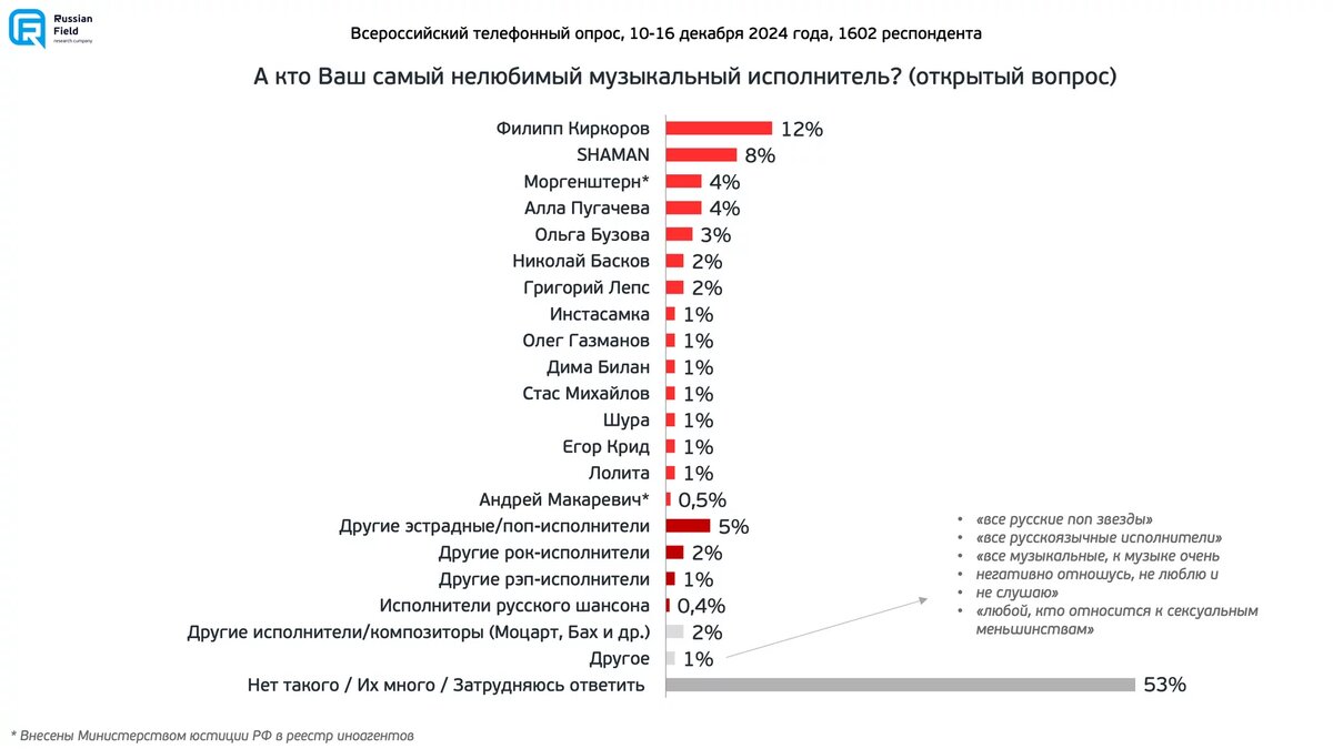 Согласно опросу Russianfield самый НЕлюбимый музыкальный исполнитель у россиян:
