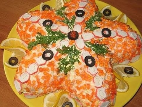 Салат «Морская звезда» — это праздничное блюдо, которое может стать украшением стола. Салат готовится из доступных ингредиентов, но при этом имеет оригинальный вкус и привлекательный внешний вид. Ингредиенты: Рецепт: Отварить креветки и кальмары в подсоленной воде. Креветки варить 3–4 минуты, кальмары — 2–3 минуты. Остудить. Отварить яйца вкрутую (10 минут после закипания). Остудить и очистить. Крабовые палочки нарезать мелкими кубиками. Яйца нарезать мелкими кубиками. Твёрдый сыр натереть на крупной тёрке. Кальмары нарезать соломкой. Креветки очистить от панциря. Выложить салат слоями в форме звезды: креветки, кальмары, крабовые палочки, яйца, сыр. Каждый слой сеточка из майонеза. Украсить салат зеленью или креветками. Салат «Морская звезда» готов! Приятного аппетита!