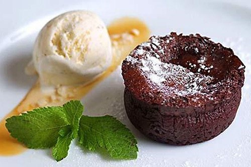 Осторожно выньте фондан из формочки и сразу же подавайте, пока он горячий с шариком ванильного мороженного, украсив листочками свежей мяты.