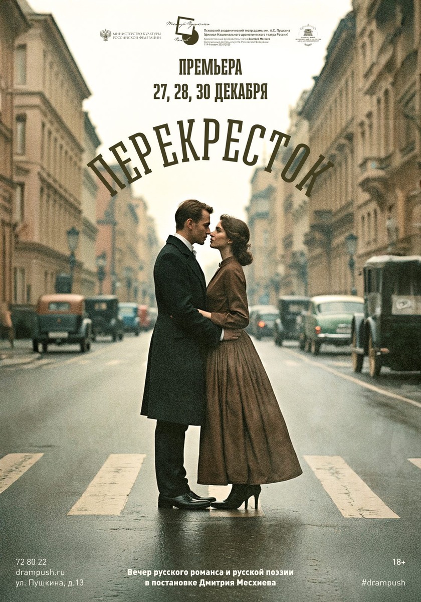 В Псковском академическом театре драмы им. А.С. Пушкина 27, 28 и 30 декабря состоится премьера вечера русского романса и русской поэзии «Перекресток», который поставил по своей идее художественный руководитель филиала «Александринки» Дмитрий Месхиев. Это будет пятый спектакль-концерт в репертуаре Псковской драмы, уточняет пресс-служба театра. Музыкальные вечера в камерных пространствах появились в афише Псковского театра драмы в 2021 году. Первый спектакль-кабаре «Постой, паровоз!» в постановке Дмитрия Месхиева встретил самый горячий отклик у псковичей и гостей города. Дальше театр представил «Постой, паровоз! Вторую ходку», «Случайный вальс», «Фламенко», и эти работы также не остались без зрительского внимания.
