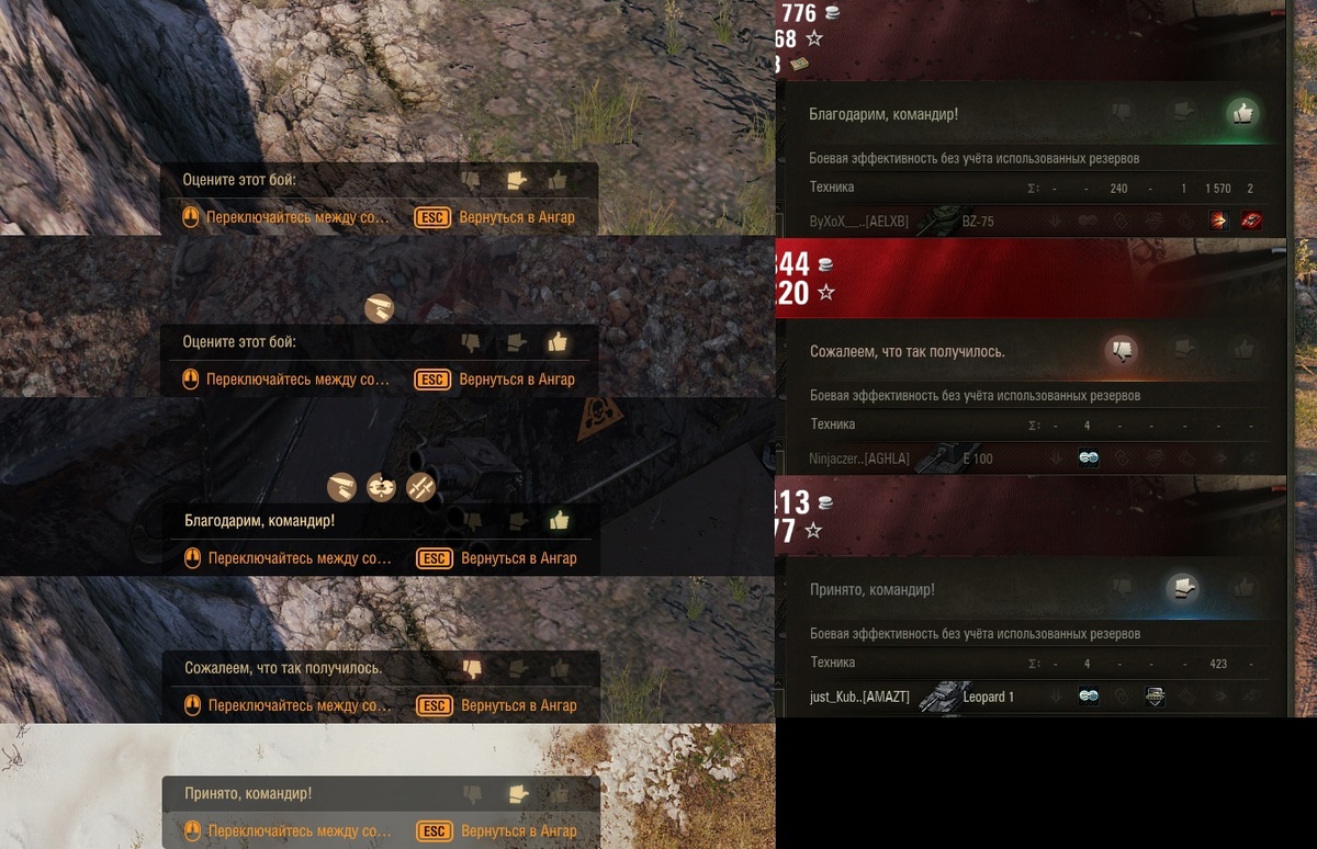 Мы решили ввести оценку боя — механику, позволяющую оценивать игровой опыт. После завершения Случайного боя, в режиме наблюдателя (если ваша техника будет уничтожена) ИЛИ на экране результатов боя вы сможете оценить свой игровой опыт, выбрав один из вариантов: Оценку боя можно также и пропустить по желанию.