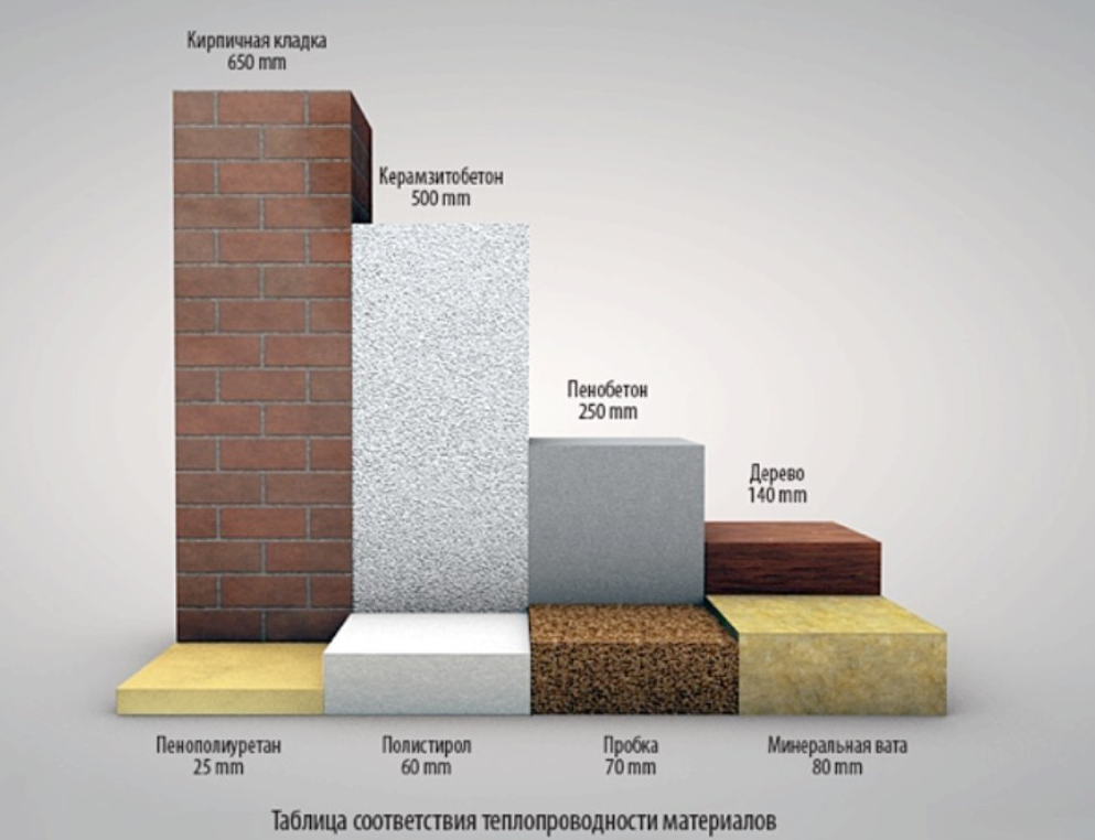 Думаю, картинку как на фото выше вы хотя бы раз в любом случае видели. Это сравнительная теплопроводность материалов. Согласно ей любой самостройщик может отказаться от бетона или кирпича и возвести стены своего будущего домика в стиле Яши Косяка. То есть взять экструдированный пенополистирол толщиной 30 мм. и в доме будет настолько тепло, что можно будет ходить без носков в майке и семейниках.