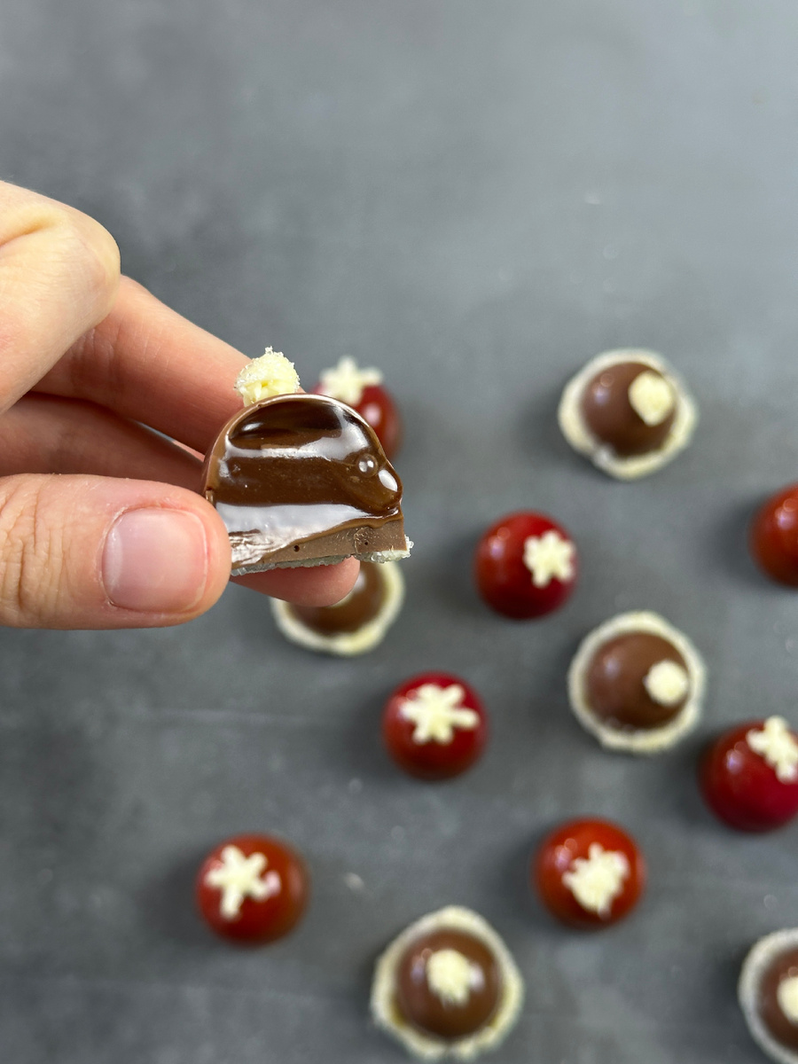 Медовая начинка Медовая редукция Мед 20 г Глюклзный сироп 20г Сахар 20г Вода 10г В одном сотейнике смешать все ингредиенты и на среднем огне поставить закипать . Увариваем до 106С . Температуру проверяем игольчатым термометром. Отсадить в форму 1/3 при 27С. МЕДОВЫЙ ГАНАШ Сливки 35% - 56 г Мед - 24 г Глюкозный сироп- 6г Сорбитол - 10 г молочный шоколад 33%- 100 г Какао-масло - 4 г В сотейнике смешайте сливки, мед, глюкозу, и сорбитол, доведите до 45С. Вылейте горячую смесь на шоколад и какао-масло Эмульгируйте при помощи погружного блендера. Охладите до 28С и отсадите в формы После отсадки оставьте на 12-24 часа при температуре 14-16С. Срок хранения начинки 45 дней при 14-16 С. Что по вкусу : Это не яркий вкус мед , а наоборот есть после вкусе меда . Мне так больше нравится . Можно поиграться и создать начинку по мотивам медовика . Оставить медовую редукцию , ганаш тоже медовый только сделать с белым шоколадом и третий слой хрустящий слой медового печенья . Помните что просто так з