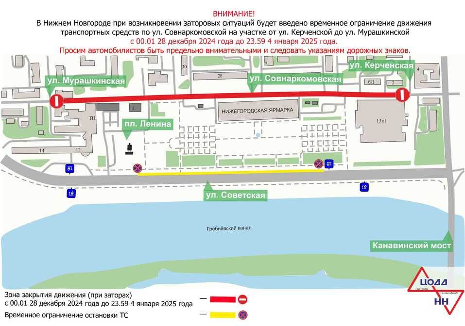 В Нижнем Новгороде в новогодние каникулы будет введен ряд ограничений для движения транспорта. В частности, при возникновении заторов с 00:01 28 декабря 2024 г. до 23:59 4 января 2025 г. будет запрещен проезд по улице Совнаркомовской — по участку от улицы Керченской до улицы Мурашкинской. По данным городского департамента транспорта, с 17:00 31 декабря 2024 г. до 9:00 1 января 2025 г. также будет перекрыт проезд от Верхневолжской набережной до улицы Минина на площади Минина. NN.DK.RU писал также, что 26 декабря 2024 г. в Нижнем Новгороде ввели запрет на остановку и стоянку на части Нижневолжской набережной.