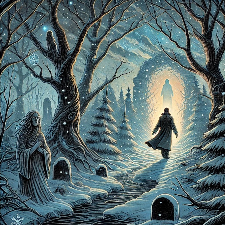 Притча: Почему человек заблудился в снежном лесу и как нашёл дорогу к свету Человек долго блуждал по заснеженному лесу, чувствуя, как холод пробирается не только под одежду, но и в душу. Его окружали мрачные деревья с запутанными ветвями, из которых капал ледяной иней, словно капли слёз. Каждая тропа, на которую он ступал, вела его всё глубже в тьму, где снег переставал искриться, а воздух становился тяжёлым. Он чувствовал, что силы покидают его. Мысли, как ветки, опутывали сознание: «Я никогда не найду выход. Этот лес — это я. Всё запутано, и свет больше не вернётся». Но вдруг на одной из веток блеснула снежинка. Она сверкнула так ярко, что человек на мгновение замер. Ещё одна снежинка, а за ней третья, упали перед ним, словно указывая путь. Он не знал, откуда появился этот свет, но сердце подсказало: «Иди». Человек сделал первый шаг. За ним второй. С каждым шагом лес начинал меняться: мрачные деревья уступали место искрящимся елям, покрытым сверкающим инеем. Он понял, что свет, исход