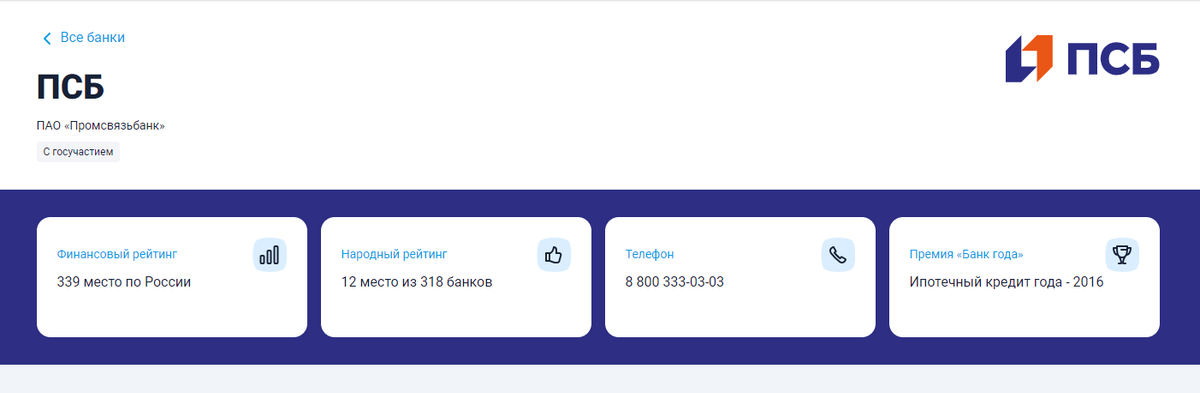 По привычке немного информации Промсвязьбанке. Как видно из скрина с сайта Банки.ру, ПСБ - банк с госучастием, 12место в народном рейтинге. Проблем с этим банков никогда не будет.