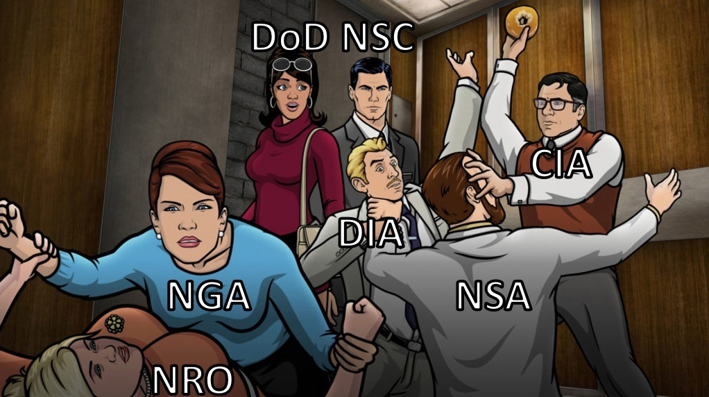 Также показательна история создания Национального разведывательного управления (NRO). В 1960 году на фоне слабого прогресса в работах по спутниковой разведке Минобороны и ЦРУ создали отдельную структуру для координации усилий. Из-за терок между ЦРУ и АНБ, последнюю организацию в эту структуру не позвали. При этом NRO стало отдельной разведслужбой, подчиненной не директору ЦРУ, а министру обороны. Все потому, что военные боялись ухода бюджетов, выданных на спутники, в ЦРУ.