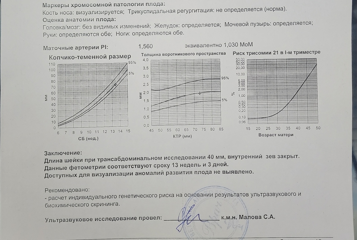Оказалось, что мои результаты анализов тоже идеальные. Риски СД низкие - 1:1514. Высоким считается риск - 1:100 и ниже, в некоторых центрах - 1:250. Риски на другие синдромы (Патау, Эдвардса) - 1: 40 000. В будущем минимальны риски преэклампсии (осложнение беременности, родов и послеродового периода, которое характеризуется повышением давления), как и задержки роста плода мне не грозит. ХГЧ и РАРР-А в норме. В кабинете генетика я выдыхаю с облегчением, а она улыбается и говорит: