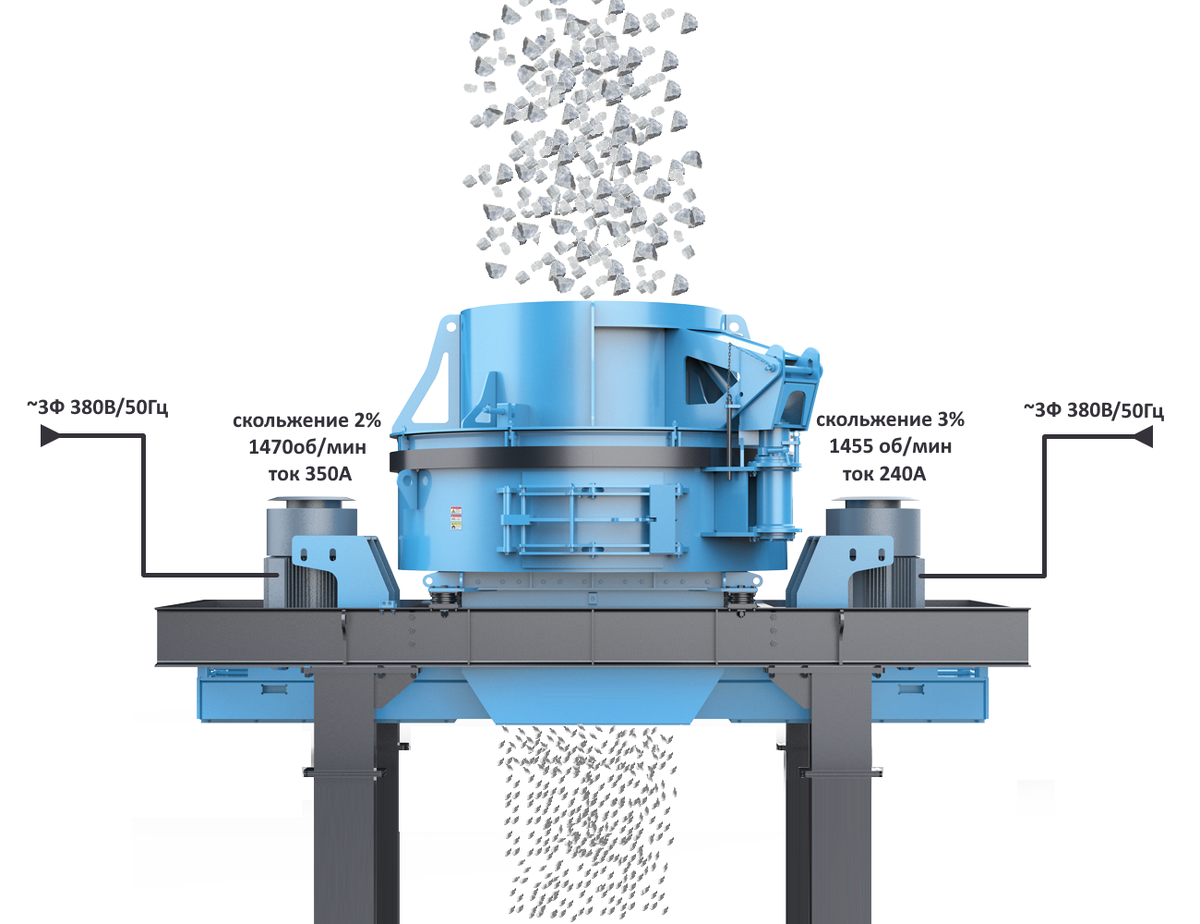 Исходная ситуация: Вертикальная дробилка с двумя электродвигателями по 160кВт 380В 289А. Один электродвигатель после перемотки имеет немного большее скольжение. Из-за этого другой электродвигатель берет на себя большую нагрузку, которая во время дробления может превышать его номинал. Что приводит к его излишнему нагреву, при продолжительной работе лак на обмотках может расплавиться, что вызовет короткое замыкание и необходимость еще одной перемотки электродвигателя. И приведет к очередному простою оборудования. Чтобы этого избежать нужно согласовать скорость работы двух электродвигателей, чтобы равномерно распределить нагрузку между ними. Решение: Оптимальным решением является установка преобразователя частоты, который позволить замедлить скорость одного электродвигателя, уровняв её со скоростью работы второго электродвигателя. Итог: Запуск происходит в два шага, сначала преобразователь частоты плавно разгоняет первый электродвигатель до заданной скорости, затем напрямую от сети уже на