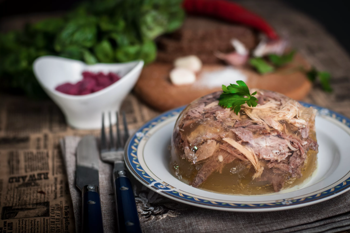 Перед подачей холодец можно украсить той же варёной морковью, которую использовали для бульона, а также зеленью, яйцом и т. п. Большое преимущество — такой холодец может храниться не менее года!