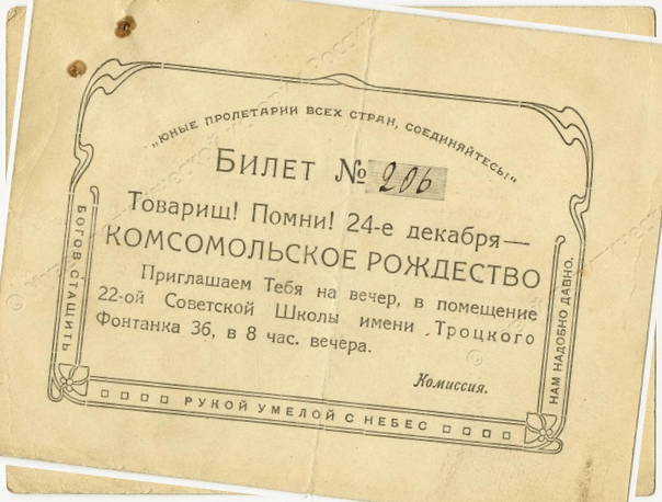 В коллекции нашего музея хранятся пригласительные билеты на такого рода мероприятия (иллюстрация) и фотографии (негативы) проведения и организации таких антирелигиозных мероприятий в Москве в 1922, 1923 годов. Масштаб «комсомольского рождества» был велик. Они прокатились по многим городам России, охватил не только столицы, но и Самару, Ставрополь, Вятку, Курск и др.