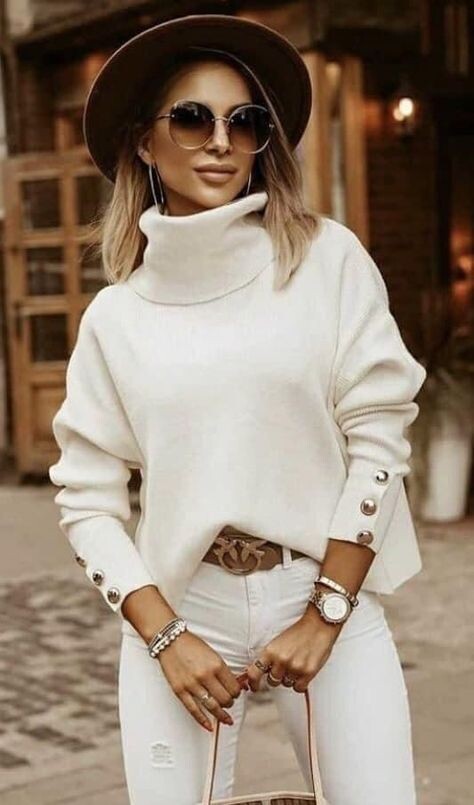 Белый цвет порой проблематично носить женщинам за 40... особенно в виде брюк. Белый цвет, как правило, делает фигуру крупнее, чем она есть, что обычно дает эффект неуверенности в себе. Но есть несколько секретов и советов, как носить белые джинсы после 40, которые помогут вам чувствовать себя уверенно и выглядеть стильно. 1. Один из способов носить белые джинсы - это монохромный, полностью белый образ. Это может быть не в вашей зоне комфорта, но... это так шикарно и свежо! Выбирайте джинсы, которые хорошо тянутся, и прямого кроя, чтобы они не слишком облегали фигуру, что выглядит более выигрышно... особенно когда дело касается белых джинсов. Должны ли белые цвета идеально сочетаться? Нет! Будет ли кремовый или молочный топ выглядеть так же потрясающе? Конечно, будет. Монохромный образ - это модно, но не переусердствуйте. Разбавьте белый цвет золотыми аксессуарами, двусторонним кожаным ремнем, например, и туфлями на платформе или кроссовками. 2. В этом образе также белые джинсы, но бе