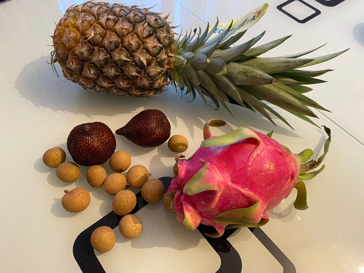 Вот и сегодня зашла в магазин, купила ананас, от нового поставщика. Интересно как сильно отличаются по вкусу ананасы из Бразилии и Коста Рики. Костариканец был небольшого размера по сравнению с бразильцем, вполне свеженьким, не подморожен, нижняя часть султанчика светло-зеленого цвета, и значит должен быстро укорениться. Будет новенький в коллекции моих ананасов. На вкус пока не пробовали, оставили до праздника. Питахайя уже привычный всем нам кактусовый фрукт, продается повсеместно, розовые, желтые. На упаковке страна производитель не была указана, к сожалению. У этой чудо - ягодки запах отсутствует. Ни сн