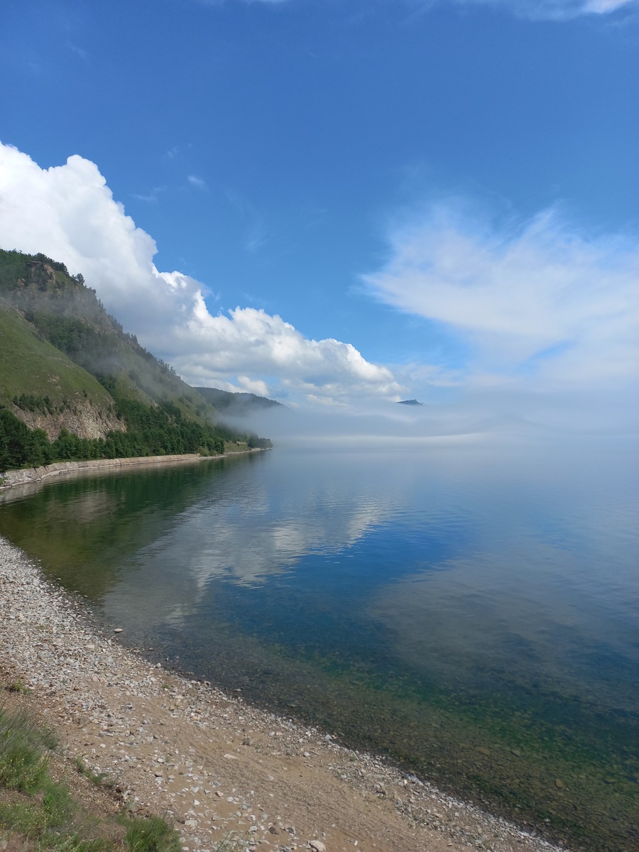 А красота, конечно, невероятная. Байкал в тот день был гладкий, как стекло, вода сливалась с небом, да ещё и туман придавал живописности.
