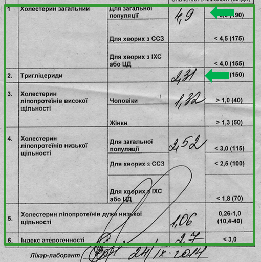 Недавно попался на глаза интересный документ - бланк лабораторного анализа с результатами липидограммы, выполненной на Украине (или в Украине?). В свое время я подсчитывал, сколько во мне украинского, если считать по происхождению предков, насчитал 3/8 - столько же, сколько и русского, и даже по итогу больше, чем греческого. Однако украинского языка я не знаю, и никто в семье (во всяком случае, при мне) никогда по-украински не говорил, хотя две бабушки и знали его. Поэтому для моего привычного в основном к русской речи уха крайне непривычно звучат такие термины, как "липопротеины низкой щильности". Или даже: "дуже низкой". Как видите, референсные интервалы по холестерину высокой щильности указаны здесь отдельно для "чоловiков" и отдельно для "жiнок", поскольку у женщин обычно этот показатель выше, за счет эффектов эстрогенов, чем у мужчин.