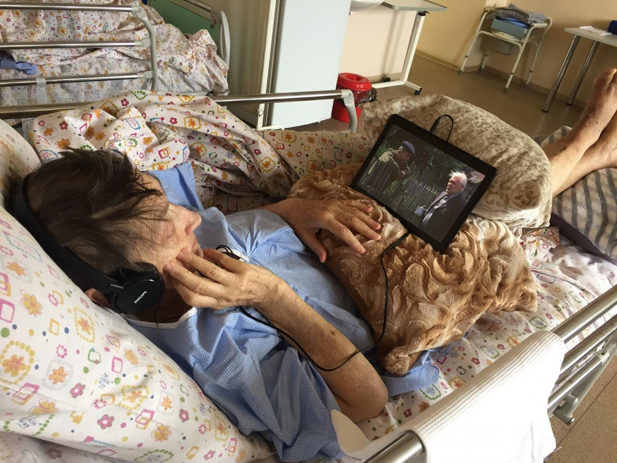 «Из будней хосписа. Юрий Андреевич часто выезжает в холл смотреть любимые фильмы: русские детективы и западные вестерны. Всё бы ничего, если бы не акустика холла, которая при выкриках майора Пронина “Стой, стрелять буду!” заставляет подпрыгнуть каждого. И всё это обязательно вприкуску с мороженым. На мои просьбы посмотреть что-то более романтичное и милосердное выдаётся фраза: “Ещё чего, под мороженое — самое то!”. А другой пациент очень любит телеспектакли “Современника”. Однажды мы несколько дней гадали, что за фильм про жёлтые панталоны он хочет посмотреть. Оказалось, речь шла о жёлтых чулках Мальволио из “Двенадцатой ночи”. Пациент считал это самым смешным моментом спектакля и очень хотел, чтобы мы тоже оценили. Так и живём…» — рассказывают координаторы. В хосписах кино имеет особое значение. Большую часть времени тяжелобольные люди проводят в постели в своей комнате. Бывают периоды, когда сложно выезжать на улицу, кто-то совсем теряет возможность двигаться и говорить. Однако просм