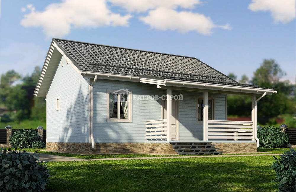 Кир – одноэтажный каркасный дом, с террасой, общие размеры – 7,5х7м. Планировкой предусмотрено 2 помещения, санузел, котельная, тамбур и терраса 2х5м, с ограждением перилами и балясинами, при входе устанавливаются ступени. • Площадь: 62 м2