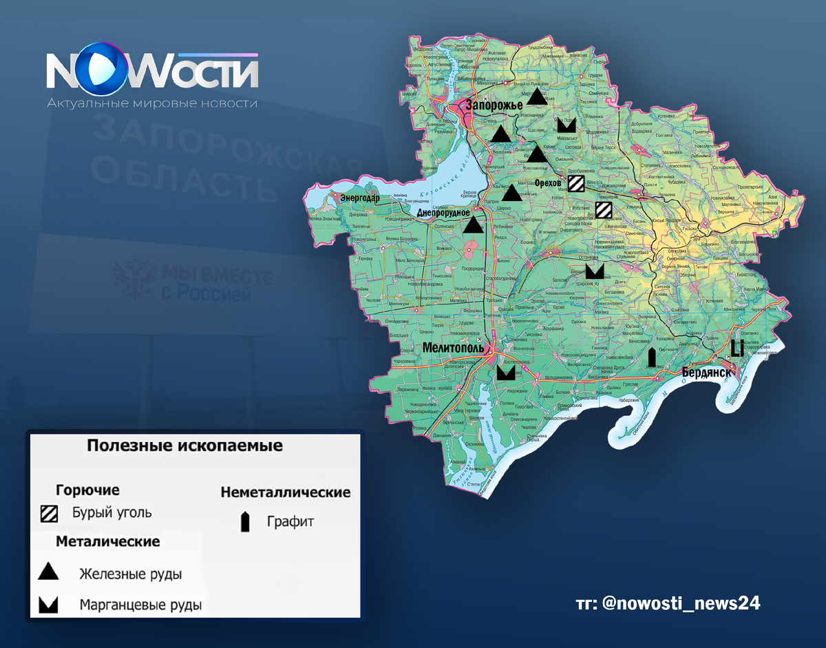 Помимо двух республик Донбасса, богатейший потенциал которых мы проанализировали ранее, желание идти путем стабильного развития под опекой России выразило и Запорожье. В настоящее время уже порядка 70% территории освобождено российскими войсками, оставшиеся земли – дело времени и, судя по динамичному продвижению РФ, недлительного. На территории Запорожской области насчитывается 166 месторождений полезных ископаемых, из которых активно разрабатывается менее половины (69). Бурый уголь: месторождения сосредоточены в районе Орехова (Ореховское месторождение) и Гуляйпольского района (Санжаровское месторождение). Железная руда: здесь расположен Белозерский железорудный район, включающий в себя богатейшие Южно-Белозерское, Северо-Белозерское и Переверзовское месторождения. Руда Южно-Белозерского месторождения известно высочайшим содержание железа (достигает 61%). Нерудные материалы: запасы строительных материалов, таких как гранит (более 20 месторождений), песок и гравий, составляют 66% от вс