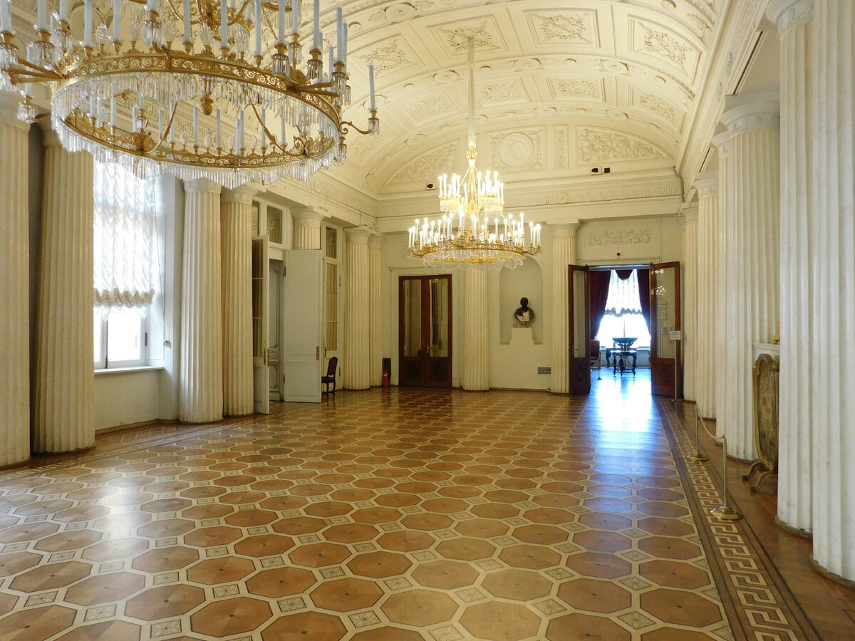 Арапская столовая. Архитектурное решение Арапской столовой было создано еще в 1780-е годы И.Е.Старовым и было воссоздано A.П. Брюлловым после пожара без изменений. Сдвоенные трехчетвертные колонны из желтоватого искусственного мрамора, стоящие по периметру, поддерживают архитрав и фриз с меандром. Цилиндрический кессонированный свод украшен богатым лепным орнаментом. Две великолепные люстры из золоченой бронзы и хрусталя, воссозданные по старым акварелям и наброску А.П. Брюллова, завершают декор зала Своим наименованием зал обязан придворным слугам, именовавшимися арапами и стоявшими при дверях Арапской столовой. Еще можно посмотреть видео: Санкт-Петербург. Государственный Эрмитаж Видео и статьи о Санкт-Петербурге можно найти в этой подборке
