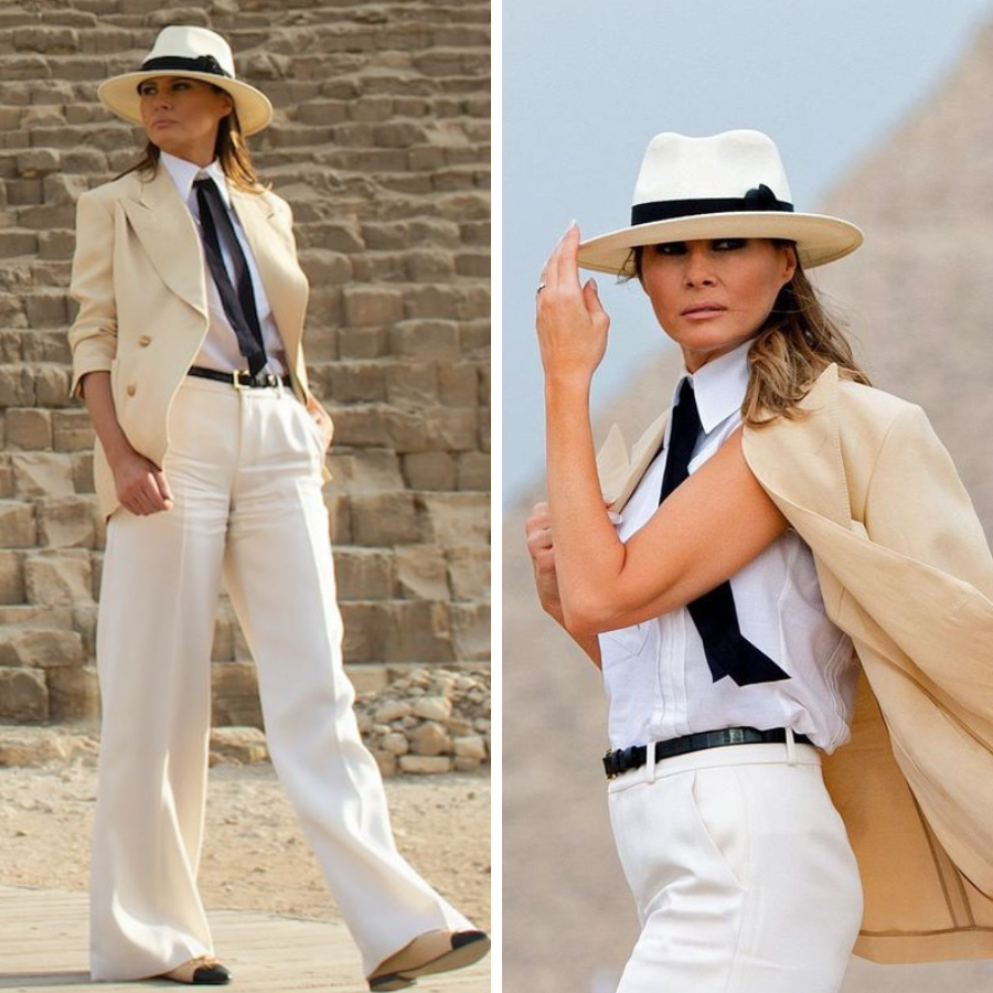Даже базовые вещи иногда представляют опасность для имиджа. Так, для поездки к пирамидам Гизы в Египте миссис Трамп, очевидно, взяла за образец образы европейских археологов.
