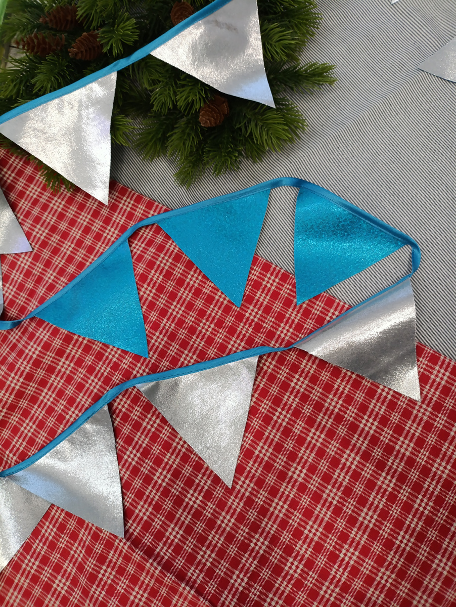 Я никогда не была фанатом различного рода флажков. Но с ростом популярности картонных флажков с новогодними изображениями в стиле винтаж, моя категоричность в этом вопросе таяла. Итак, сначала я заказала именно такие флажки, а потом крепко призадумалась..... Обычные хлопковые (льняные) красные флажки меня совершенно не устраивали. Ну, они же есть у всех!!! Мне надо что-то свое. Кроме того, Новый Год на носу, обычным красным цветом не отделаешься. Так я пришла к самому необычному и самому подходящему полотну: трикотаж диско и иное виды трикотажа с люрексом. Таких гирлянд нет ни у кого!!! Вся проблема в том, что свойства той же бязи и тонкого трикотажа диско совершенно разные. Если сшить кусочки бязи лицом к лицу, подрезать припуски и вывернуть, отутюжить, то получится крепкий треугольничек, почти готовый флажок. Если тоже самое проделать с трикотажем, то получится хлипкий мешок, который совершенно не держит форму. Таким образом, передо мной возникла проблема. Решение искала с неделю. Сн