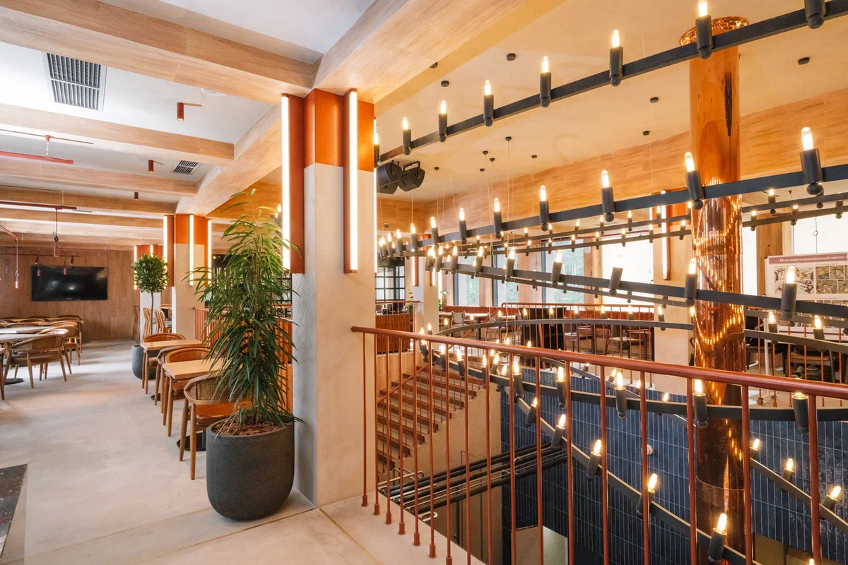 Ресторан включает два зала общей площадью 470 м². Терраса открывает панорамные виды на Кавказский хребет, а камерный VIP-зал с уютной верандой идеально подходит для приватных встреч и торжественных событий.