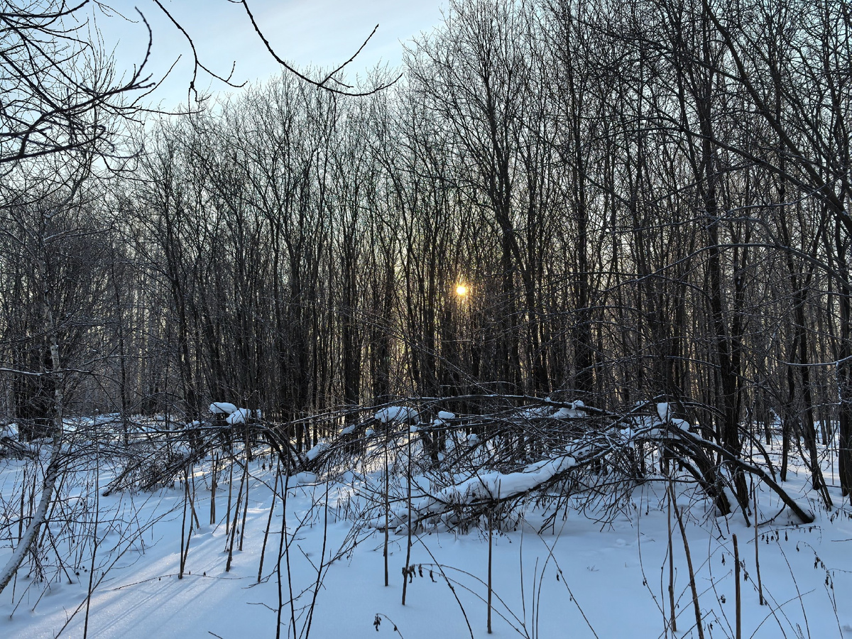 Как и внезапные пирушки, такие охоты запоминаются надолго. Назавтра синоптики обещали пасмурную, с ветром и снегом холодную погоду, но природа, обычно, распоряжается по-своему. Накануне, я допоздна провозился с «нивой» в гараже. Не очень веря в предсказания гидрометцентра, поставил будильник на семь тридцать, надеясь, что проснувшись, уже по факту решу, отправляться ли на охоту. Утром решил поваляться подольше. Посмотрел в окно – в сумерках казалось, что прогноз сбылся наполовину – снега и ветра не было, но тучи висели на фоне светлеющего восхода. Неспешно собрался, позавтракал и выехал в угодья. С восходом солнца мир преобразился. Всё вокруг сверкало и искрилось, воздух казался прозрачным, как хрусталь. Постепенно солнце поднялось над кромкой леса и каждое деревцо, каждая травинка засверкали ярким бриллиантовым ожерельем. Лыжи приятно и ходко скользили по уже успевшему взяться настом свежему снегу. Чистый морозный воздух приятно холодил грудь на вдохе. Постепенно начали попадаться ст