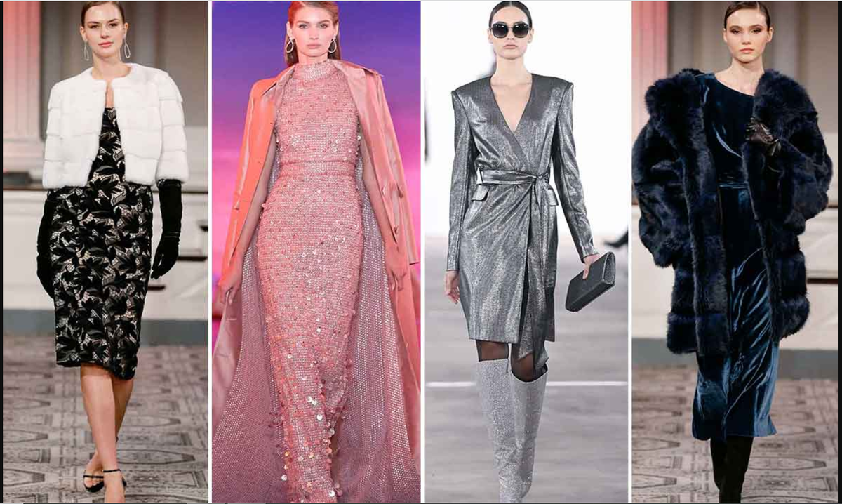 Чистый цвет также для платьев зимы 2025, украшенных стразами, пайетками и кристаллами , настоящий тренд на модных показах. Они варьируются от вечерних платьев с лифом, украшенным блестящими камнями, и атласной юбки до платьев с запахом 2025, полностью покрытых светлыми блестящими пайетками.