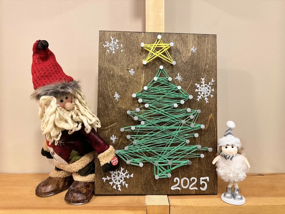 В этом году решили сделать украшение в технике string-art — из забитых в дощечку гвоздей и натянутых между ними нитями. Сейчас расскажу и покажу, как мы работали, и что получилось в итоге.