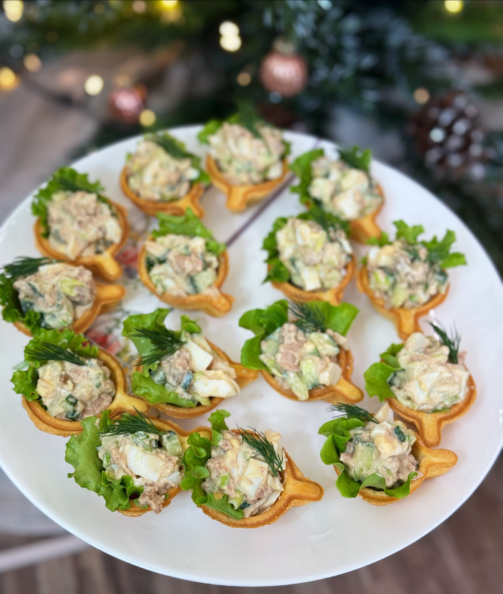 Красная рыба Творожный сыр Зелень Красная игра Нарезать мелко рыбу, зелень и смешать с творожным сыром. Заполнить тарталетки. Украсить зеленью или красной икрой. Авокадо Творожный сыр Лимон Красная рыба Зелень Авокадо и зелень измельчить в пюре погружным блендером и добавить лимонный сок (это устраняется потемнение авокадо) Смешать все с творожным сыром. Заполнить тарталетки и сверху украсить ломтиками красной рыбы и зелени. Яйца отварные Сыр твердый Огурец свежий Чеснок свежий Зелень Перец черный молотый Соль Майонез Яйца, огурец, чеснок и сыр натереть на мелкой терке. Смешать и добавить соль, перец и майонез. Перемешать и заполнить тарталетки. Украсить зеленью. Шпроты Творожный сыр Яйца отварные Укроп Перец черный молотый Яйца натереть на мелкой терке и смешать с творожным сыром и измельченым укропом, добавить молотый перец. Выложить в тарталетки и сверху положить по рыбке. Крабовые палочки Твердый сыр Яйца отварные Зелень Майонез Крабовые палочки, сыр и яйца нат