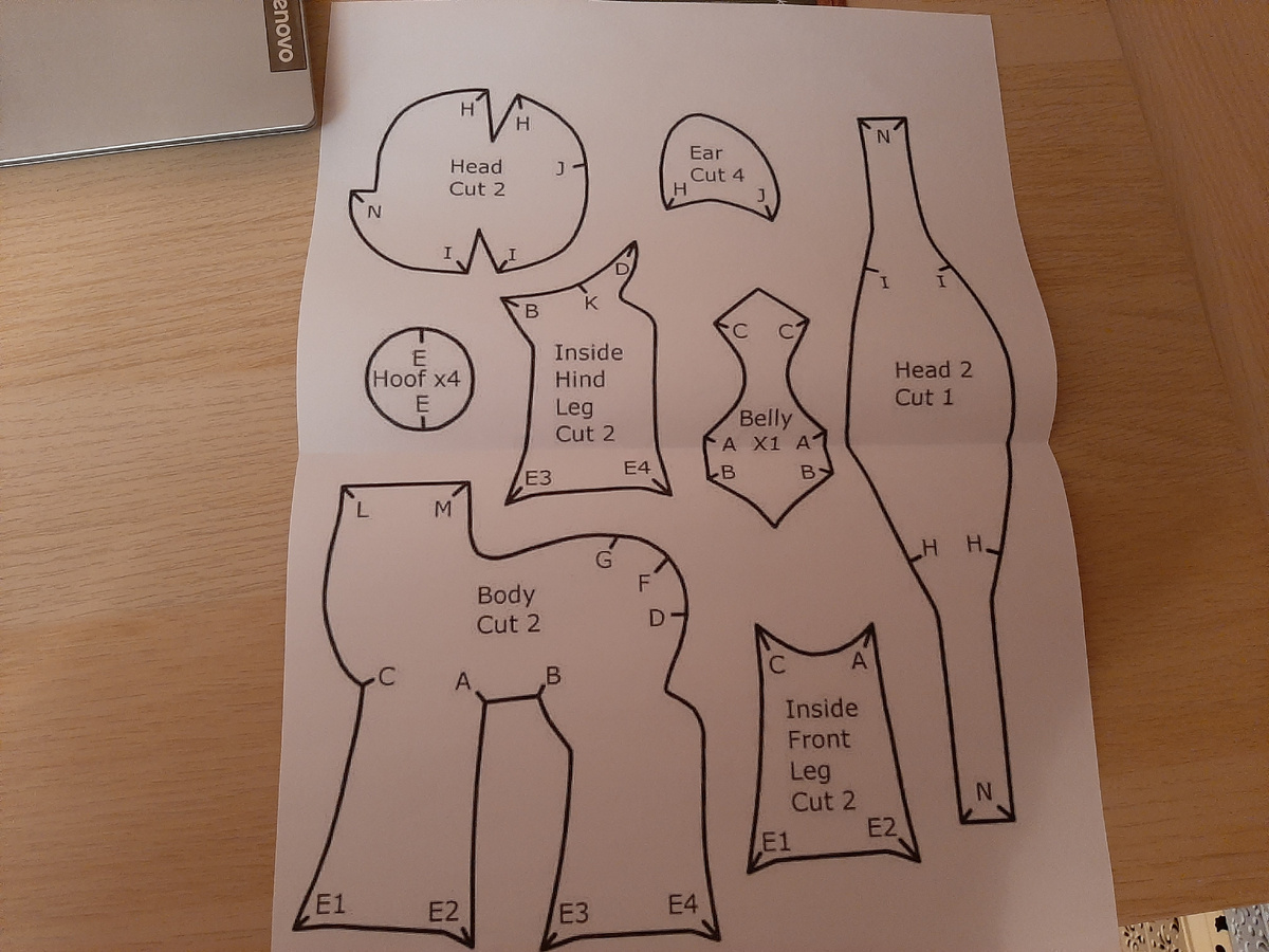 Названия деталей, как видно на фото, были на английском. Но переводчиков сейчас предостаточно, даже если, как подметили в известном фильме, "язык на уровне школьной программы". Вот и распечатала, не боясь ошибиться, где голова или копыто, на бумаге формата А3. И сразу пожалела: плюша купила столько, что можно было замахнуться и на А2, и на А1. Успокоила себя тем, что попробую, набью руку, а после как-нибудь создам зверушку побольше и "позамысловатей".
