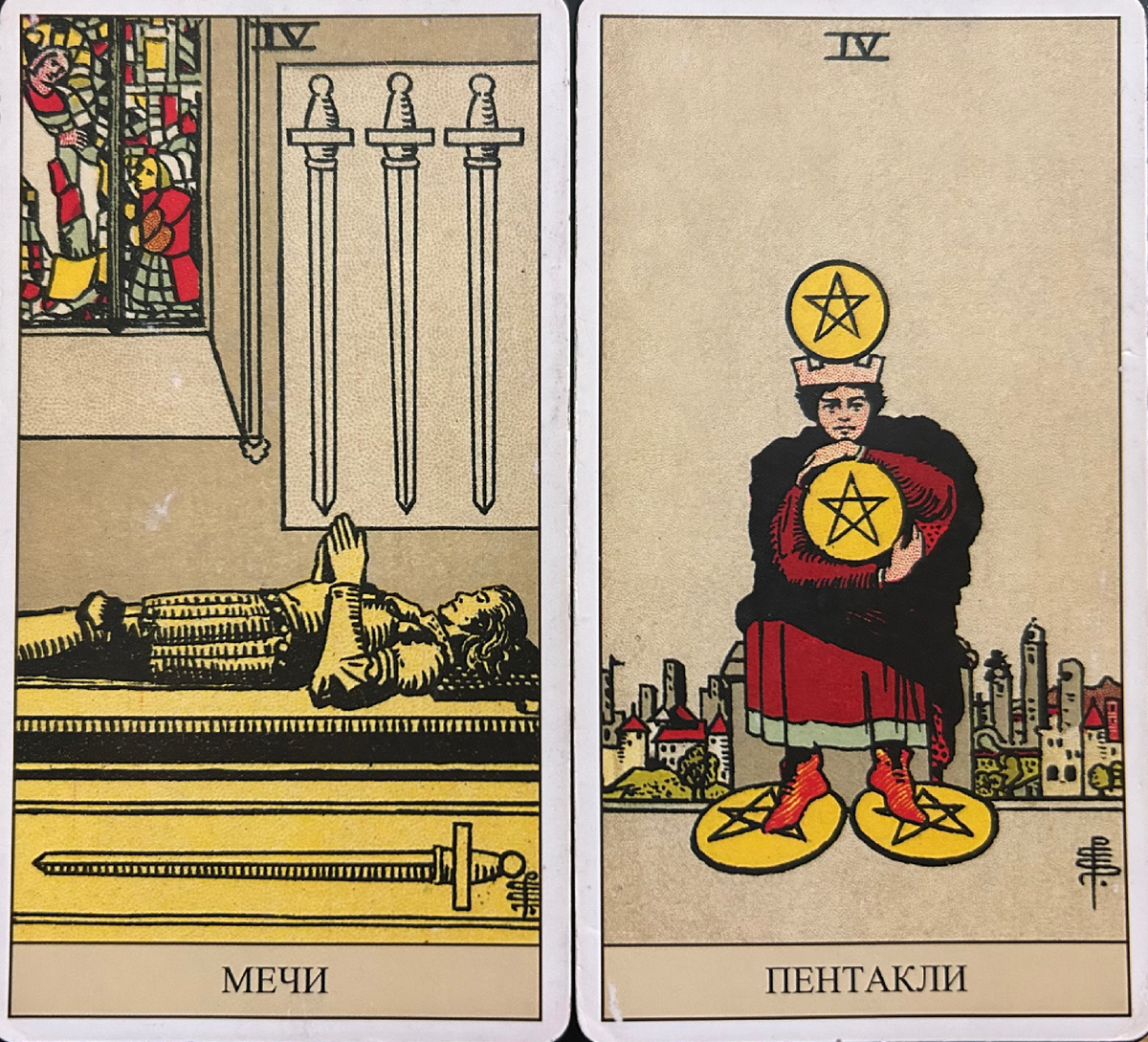 В мире Таро есть такие пары, которые на первый взгляд совершенно не связаны. Например, 4 Мечей и 4 Пентаклей. Один любит поваляться на диване и созерцать потолок, другой — считать монеты и запирать их в сейф на три замка. Но если приглядеться, между ними больше общего, чем кажется. Давайте разберем эти карты, как двух соседей в подъезде: одного вечно не видно (4 Мечей), а второй никогда не отдаст вам соли (4 Пентаклей). Этот аркан — о человеке, который устал настолько, что даже мечи, символ борьбы, просто сложил рядом и улёгся. Что ж, он заслужил свой отдых, и кто мы, чтобы его судить? 4 Мечей говорит: «Бывают дни, когда надо просто лечь и не двигаться, иначе ничего хорошего не получится». В этом аркане нет суеты, только пауза, глубокое дыхание и тишина. А вот 4 Пентаклей — это типичный скупердяй. Этот аркан любит всё держать под контролем: деньги, эмоции, да и вообще все вокруг. Символ стабильности, накопительства и легкой жадности. 4 Пентаклей говорит: «Не трать лишнего, не доверя