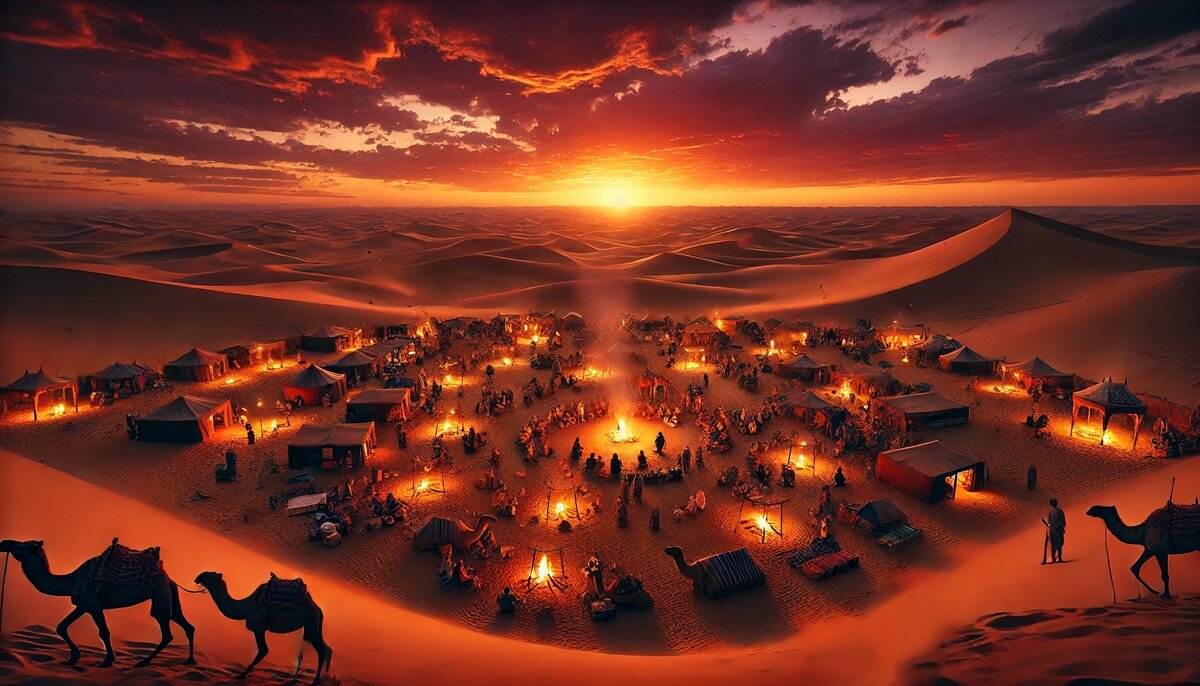 Великая Пустыня Саар'Хад, также известная как Огненные Пески, представляет собой одно из самых суровых и неизведанных мест на карте мира. Её песчаные дюны разделяют Священную Халифию и Великую Могульскую Империю, превращая пустыню одновременно в барьер и важнейший торговый маршрут. Золотой Путь, пересекающий её бескрайние просторы, является жизненно важной дорогой для караванов, и их владельцев, которые ищут богатства путем торговли, несмотря на все связанные с этим риски. Саар'Хад — это бескрайние пески, среди которых редкие оазисы служат единственными островками жизни. Днём температура поднимается так высоко, что песок кажется пылающим, а ночью резкое похолодание вынуждает путников искать тепло у костров. Легенды гласят, что в глубинах пустыни лежат земли огненных демонов, где жара превращает песок в стекло. Эти области, как говорят, скрывают несметные сокровища, но никто из тех, кто отправлялся их искать, не вернулся. Золотой Путь, связывающий Халифию и Великую Могульскую Империю, з