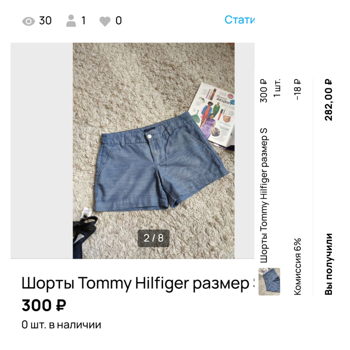 Всем привет! Я продолжаю свой эксперимент по увеличению дохода с продажи стартового бесплатного пакета игрушек. В моей копилке на момент последней статьи из этих серий было 1288 рублей и девять активных объявлений. Потом продажи встали. Покупки я тоже перестала совершать, потому что решила не уменьшать сумму из копилки меньше, чем тысяча рублей. Вот последняя восьмая серия на эту тему: Продажа за две недели случилась всего одна. Это шорты Tommy Hilfiger. Покупала их за 70 рублей, думала из за бренда продам дорого. Дома, как всегда бывает, увидела дефект - ткань "полосила", как будто это результат от применения отбеливателя. То ли это заводской брак , то ли такая задумка была, а то ли действительно был отбеливатель, я не поняла. И указав этот ньюанс в объявлении, выставила шорты на Авито за 350 рублей. Мой кошелек пополнился на 282 рубля. И, конечно же, я пошла совершать новые покупки. В этот раз оправилась на барахолку. Я купила журнал Бурда и пачку советских выкроек из журна