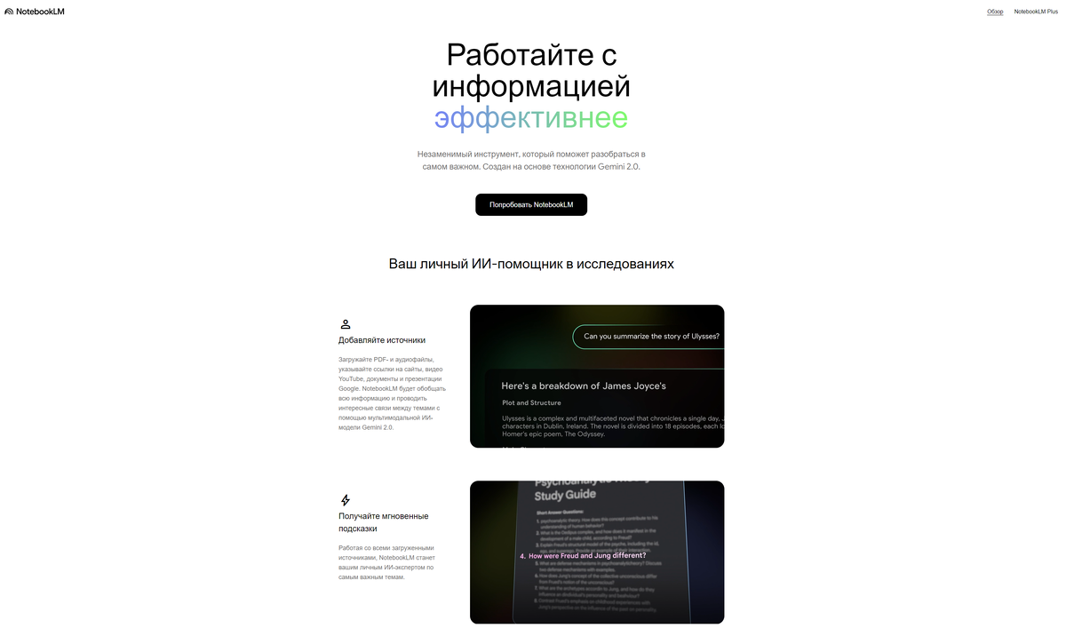 Google представил интеллектуальный помощник NotebookLM, который способен моментально преобразовать сложные видео с YouTube в понятные конспекты и структурированные документы. Теперь это возможно и на русском языке. В мире, где объём создаваемого контента растёт с неимоверной скоростью, NotebookLM становится прорывным решением для тех, кто ищет удобные и эффективные способы обработки информации. Он значительно упрощает анализ, подходя к работе молниеносно и с аккуратностью. Ключевые возможности NotebookLM: Должен сказать, что в связке с ChatGPT этот инструмент превращается в невероятный инструмент. Теперь создание текстового контента выходит на совершенно другой уровень. Эйнштейн говорил, "Не запоминай то, что можно найти в книге." NotebookLM воплощает эту идею в жизнь, помогая быстро и эффективно работать с информацией, не перегружая память лишними деталями.