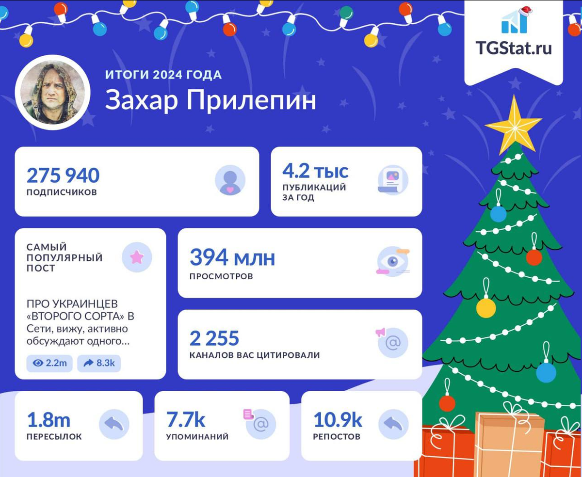 394 млн просмотров в Телеграм за год. Пятое место по цитируемости в категории «Блоги» (в России, где сотни тысяч блогов конкурируют). Ничего так. Надо, что ли, в новом году всё время какую-нибудь умную мысль повторять. Чтоб все запомнили. Бог есть. Россия святая. Мы победим. Фашизм – смрад и место обитания помойного ума и помойных ртов. Всем мира. Неонацизму – петлю.