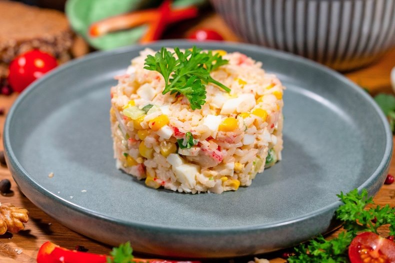 • Петрушка – 1 веточка 1. Крабовые палочки и яйца нарежьте средним кубиком. 2. Огурцы нарежьте мелким кубиком. 3. Заранее отварите рис и охладите. Затем соедините его в миске с крабовыми палочками, огурцами, кукурузой и яйцами. 4. Смешайте майонез, соус чили и измельченный зеленый лук. Заправьте салат получившимся соусом и хорошо перемешайте. 5. Установите кулинарное кольцо в центр тарелки для подачи. Заполните его доверху салатом и слегка утрамбуйте. Снимите кольцо. 6. Готовый салат украсьте петрушкой и подавайте к столу. Приятного аппетита! Подроб