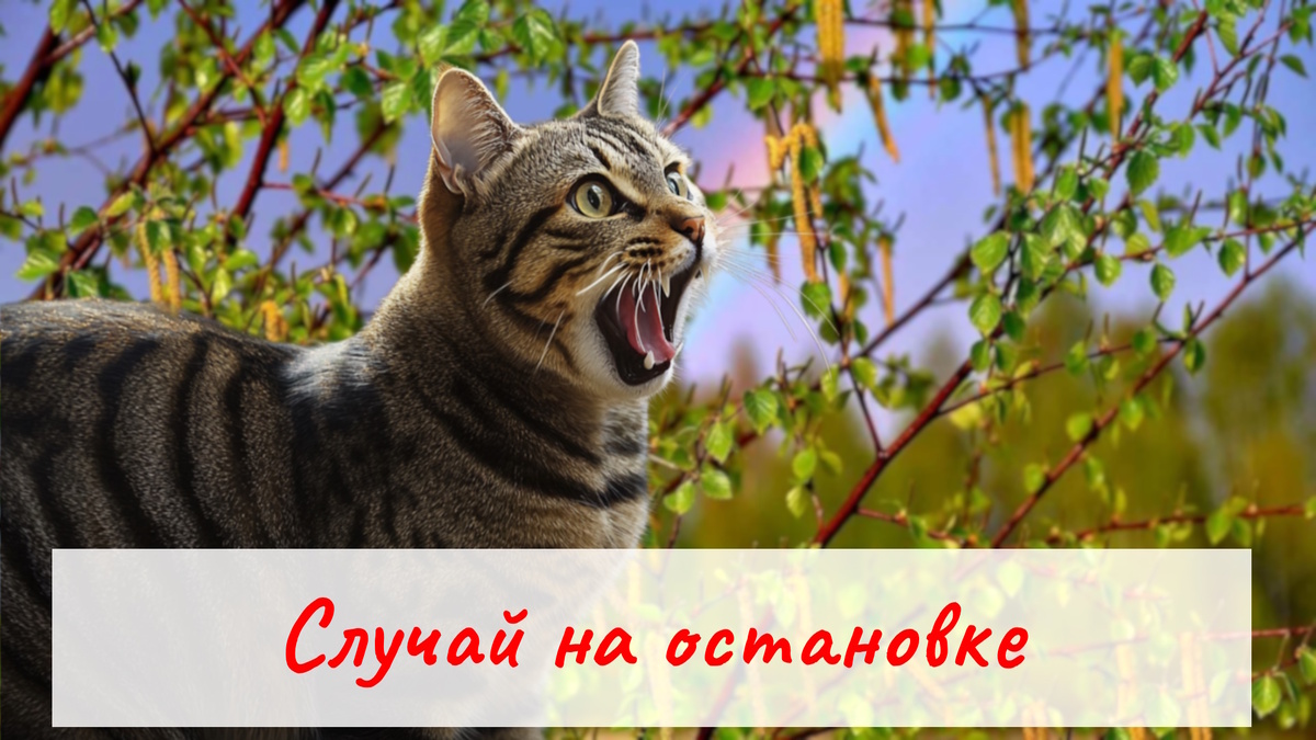 Каким-то невероятным образом, почти на самый её верх, попал угрюмый, полосатый кот. Когда ветер раскачивал тоненькую берёзку, подобно полосатому флагу, на ней раскачивался и кот.