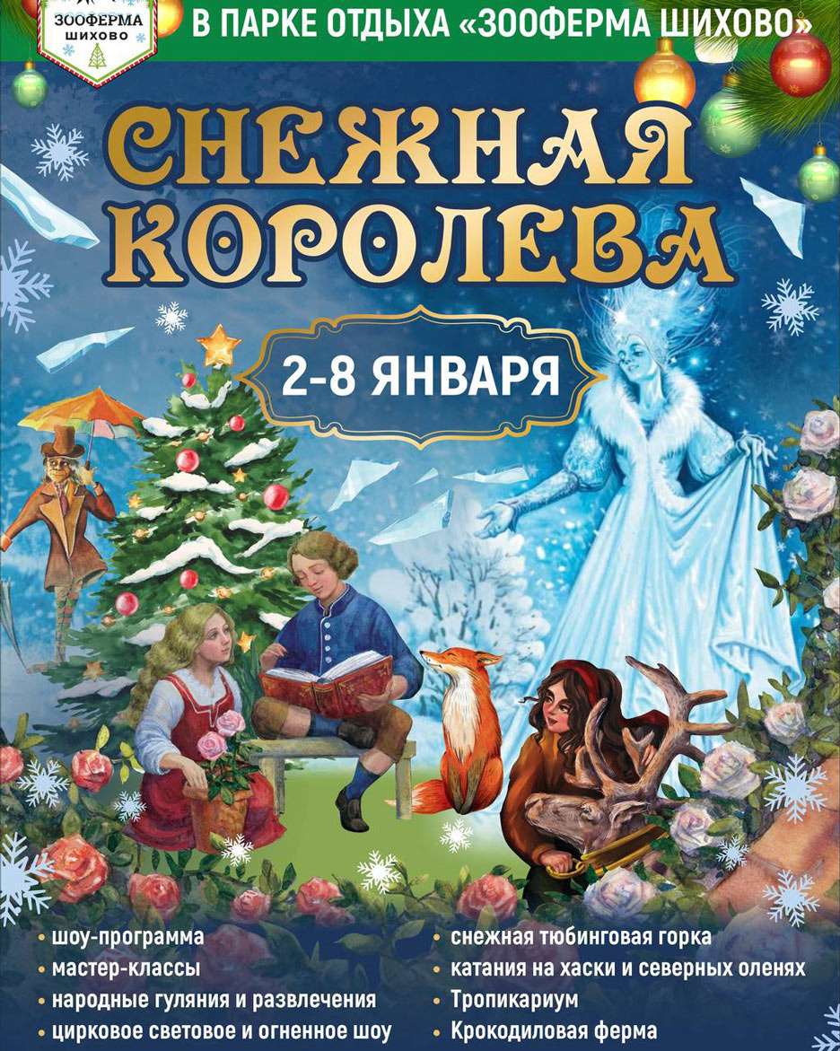 В этом году зооферма «Шихово» предлагает стать частью сказки «Снежная королева». Такая большая, красивая, увлекательная и разнообразная программа порадует всех членов семьи! Посетителей в новогодние дни ждут: Дополнительные развлечения: Подробная афиша на сайте shihovopark.ru Приезжайте гулять с друзьями! Адрес: МО, Дмитровский район, деревня Шихово, 100, стр. 1 Телефон: 8-495-255-31-21 Подробная афиша на сайте: shihovopark.ru Вконтакте, Телеграм, Инстаграм (запрещён в РФ) Реклама ИП Барышников С.П. ИНН:503213590191 erid:2VSb5wBtySY