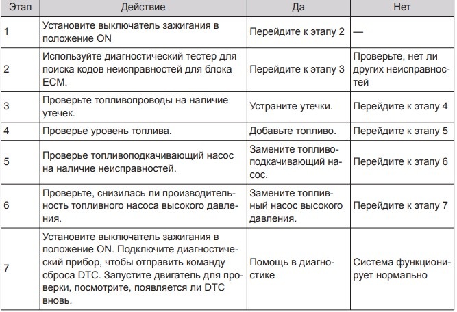 Описание кода неисправности: низкое давление в топливопроводах высокого давления во время прогрева каталитического нейтрализатора. Условия появления кода неисправности: на стадии прогрева каталитического нейтрализатора отклонение фактического давления в системе подачи топлива от целевого значения превышает пороговое значение.