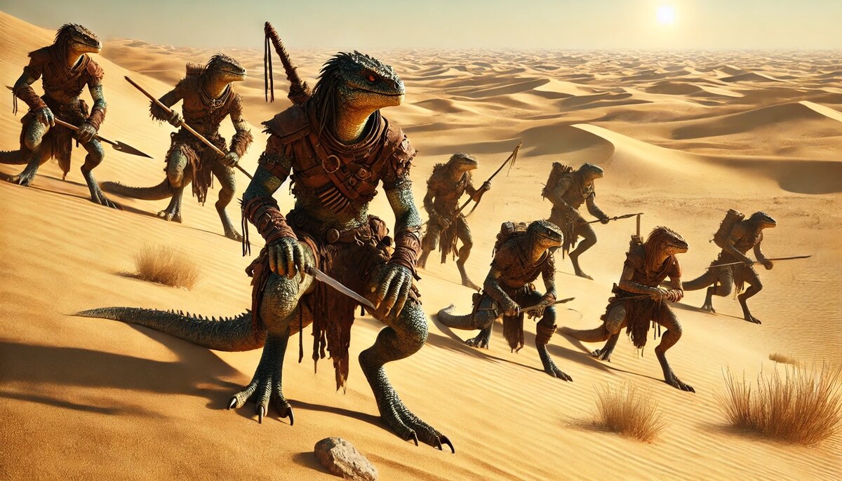 Людо-ящеры, обитающие в северных регионах Великой Пустыни Саар'Хад, представляют собой одних из самых загадочных и опасных обитателей этой суровой земли. Эти человекоподобные существа с рептильными чертами известны своей агрессивностью, хитростью и умением выживать в экстремальных условиях пустыни. Людо-ящеры имеют крепкое, мускулистое телосложение. Их кожа покрыта чешуёй, которая варьируется в цвете от песчаного до тёмно-зелёного, что позволяет им отлично маскироваться среди дюн и камней. Головы людо-ящеров увенчаны гребнями, которые могут использоваться для демонстрации доминирования или угрозы. Глаза их крупные, с вертикальными зрачками, обеспечивающими отличное зрение как при ярком солнце, так и в темноте. Каждая конечность людо-ящеров оснащена сильными когтями, которые они используют как для охоты, так и для обороны. Их зубы острые, а укусы содержат слабый токсин, вызывающий временный паралич у мелкой добычи. Эти физические характеристики делают их смертельно опасными противниками.