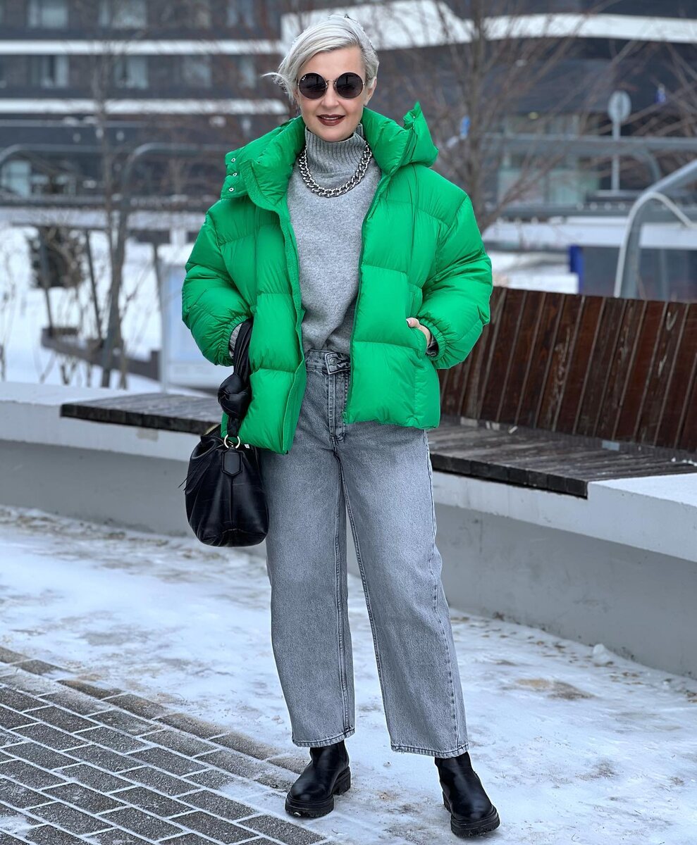Вот и наступил январь – красивый, уютный и стильный! В зимней одежде важно чувствовать себя уверенно и женственно, не жертвуя при этом комфортом. Давайте рассмотрим 12 удачных идей от блогеров элегантного возраста. Спортивный пуховик – то, что нужно для расслабленного городского образа. Носите его с вязаным свитером, джинсами, ботинками. Сумка привносит в комплект практичную нотку. Дубленка не хуже пуховика защищает от холода. Просто дополните наряд теплыми трикотажными вещами, подходящей обувью и аксессуарами. Нейтральный беж чудесно сочетается с благородными винными оттенками. Красиво, стильно, изысканно! Также бежевый «верх» хорошо ладит с ахроматическими цветами. Это может быть серый свитер, черные брюки и сапоги аналогичного цвета. Детали: кожаные перчатки, сумка, крупная бижутерия. Пуховик удлиненного кроя – идеальное решение для холодной и ветреной погоды. Обратите внимание на модели с ромбовидной и широкой горизонтальной или диагональной стежкой. Многие современные леди предпоч