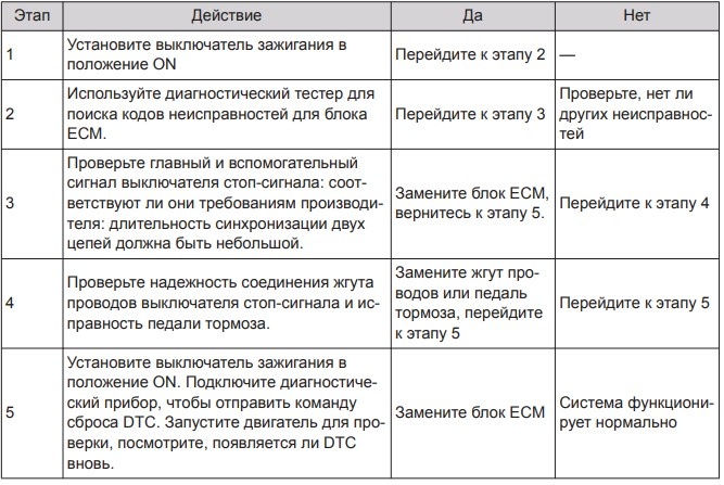 Описание кода неисправности: неисправность синхронизации сигналов в цепях выключателя стоп-сигнала педали тормоза.